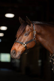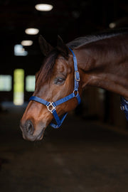 The Kensington halter is just as strong as a leather halter, with quality hardware, double stitching throughout, box stitching at sensitive points, and double folded 1" nylon everywhere except hardware locations, where it is triple folded. All adjustment holes are heat treated to prevent fraying, and the nose and cheeks are padded for horse comfort.