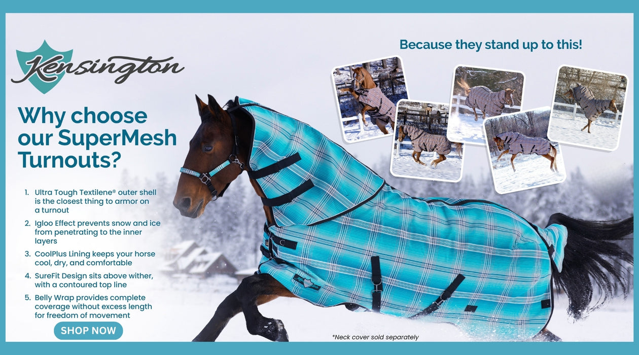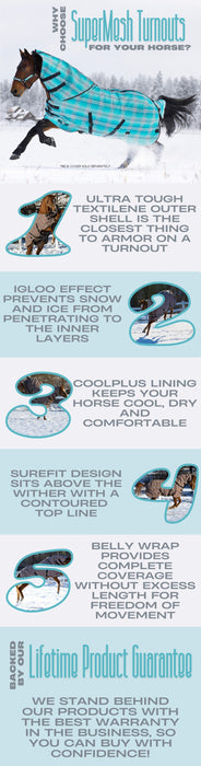 Winter has met its match with the SuperMesh Turnout! This turnout is everything to winter that our Protective Sheet is to summer. The outer shell is constructed with the same 1000 x 2000 Denier Textilene® that is found on our Protective Sheet, which acts as armor, making this the most durable turnout available on the market. Under the Textilene® is a 100% waterproof, and highly breathable layer, and an inner layer of our exclusive CoolPlus®, which pulls moisture away from your horse to help keep them dry under the blanket.