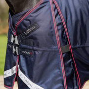 Featuring their revolutionary two-part patented skirt system as well as a new angled shoulder gusset to help relieve tension and allow a greater range of movement of the shoulder whilst the central panel self-rights the blanket and provides maximum protection. The Neck attachment features a new elasticated insert at the poll to keep your horse snug and dry even in the worst of weathers.