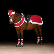 A breathable Christmas-themed quarter blanket that will add some fun to your December rides. Trimmed with faux fur, the riding blanket attaches easily to your saddle with simple straps. Pair with the matching leg wraps (#18595). Merry Christmas!