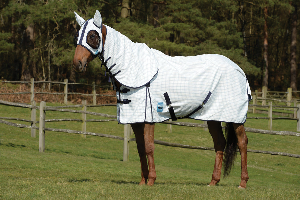 The WeatherBeeta Kool Coat Classic Fly Mask (Standard With Ears) is a durable and lightweight polyester mask with ears and mesh panels over the eyes for visibility. This Kool Coat by WeatherBeeta fly mask is ideal for protecting your horse from UV rays, as it offers over 90% UV protection (excluding mesh areas). Featuring an easy to use touch tape closure under the jaw, for a customizable fit.