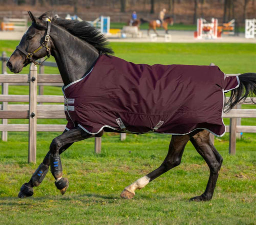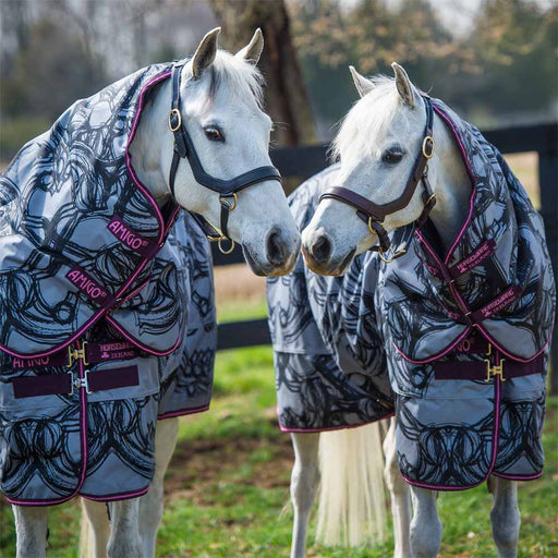 The Amigo® Stock Horse Turnout (0g Light) in a striking color combination of silver and black is a superior waterproof and breathable turnout c...