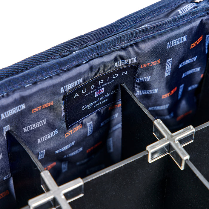 The Aubrion grooming kit bag keeps your kit organised and easy to access. The zip opening bag features an inner eight part divider, ideal for transporting bottles and keeping everything quick to find. A mesh ventilation panel keeps the air flowing for freshness. Further detail: two padded handles, hardwearing feet, Aubrion prints. Dimensions: W.34cm, D.15cm, H.26cm. Part of the smart Aubrion luggage range.