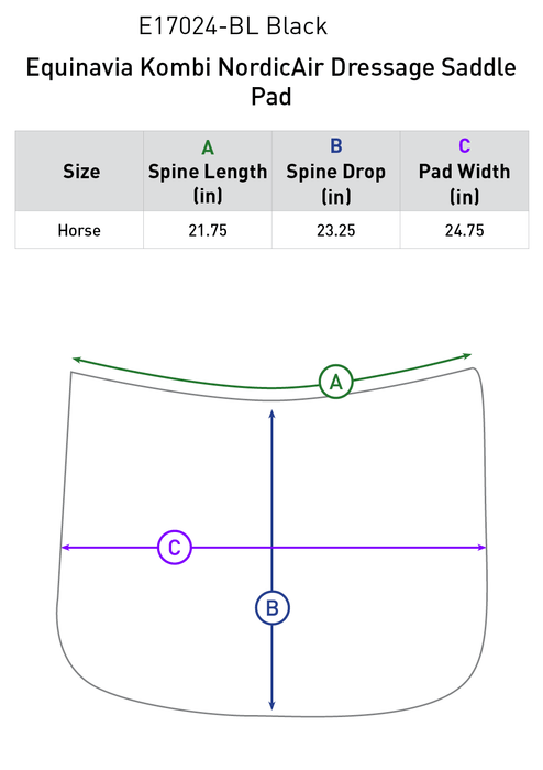 The Equinavia Kombi Dressage Saddle Pad with NordicAir™ Tech combines the functionality of a half pad with the coverage of a traditional square pad. Featuring honeycomb foam inserts covered in breathable micro-mesh for enhanced comfort in the saddle area, this pad offers both shock absorption and airflow. The contoured mesh spine increases clearance and ventilation, while the durable poly-blend fabric with a mini square quilt pattern ensures a polished look. Complete with a billet strap, nylon girth guard, and hook-and-loop D-ring straps with elastic.