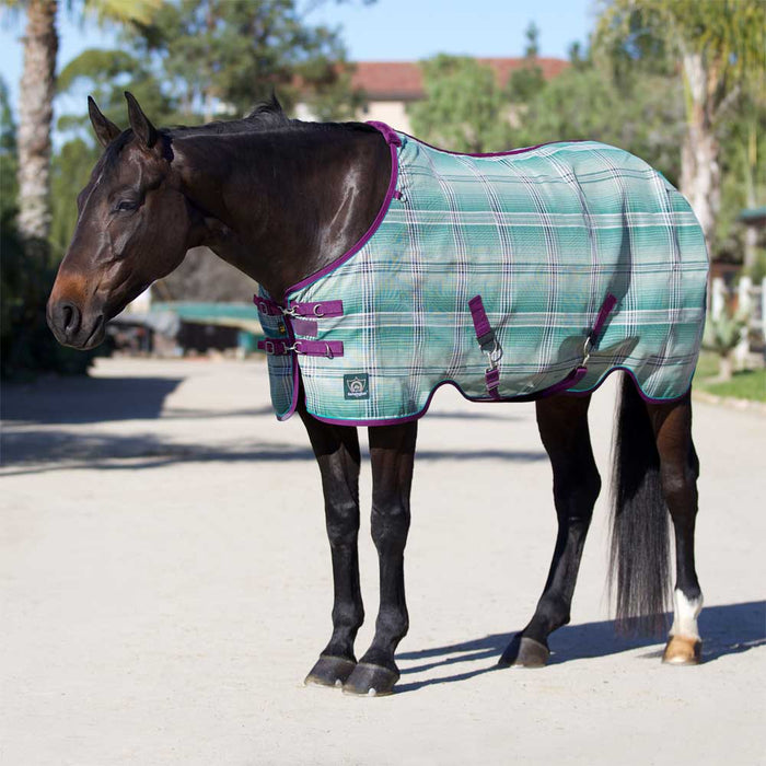 Provide comprehensive summertime protection for your horse with the Protective Sheet with SureFit. Designed to fit a wider range of horse types, from narrow and lanky to broad and stocky, it is made of ultra-durable Textilene, a 1000 x 2000 denier mesh that provides 73% UV protection, 78% air permeability, fly and insect protection, and fire resistance, while not absorbing heat from the sun or your horse. The weave actually helps shorten grooming times by not only keeping dirt and debris from the coat, but by actually working the coat as they move, bringing out the natural oils and removing loose hair. The UV protection helps keep your horse's coat from bleaching out and prevents sunburns. Air permeability and non-heat absorbing properties ensure your horse stays cool and comfortable in the hottest weather. In the event of a fire, this material also resists burning, and will stick to itself, not your horse. Features include quick clip adjustable front closures, padded wither, leg arches that provide additional adjustability for the detachable 2” criss cross surcingles with snaps and d-rings, removable and adjustable leg straps with snaps, and removable tail cover.